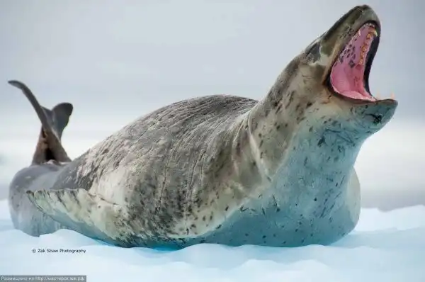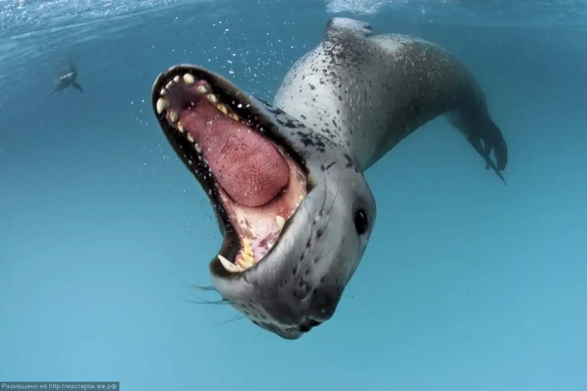 Фотограф Paul Nicklen спустился с камерой под воду, чтобы снять одного из самых грозных хищников Антарктики, морского леопарда. Полу было страшно — леопард охотится на теплокровных позвоночных (пингвинов, тюленей) и легко их разрывает на части — но профессионал в нем всё же взял верх. Это была очень крупная особь. Самка приблизилась к фотографу, открыла пасть и обхватила челюстями его руку с фотоаппаратом. Через мгновение отпустила и уплыла.