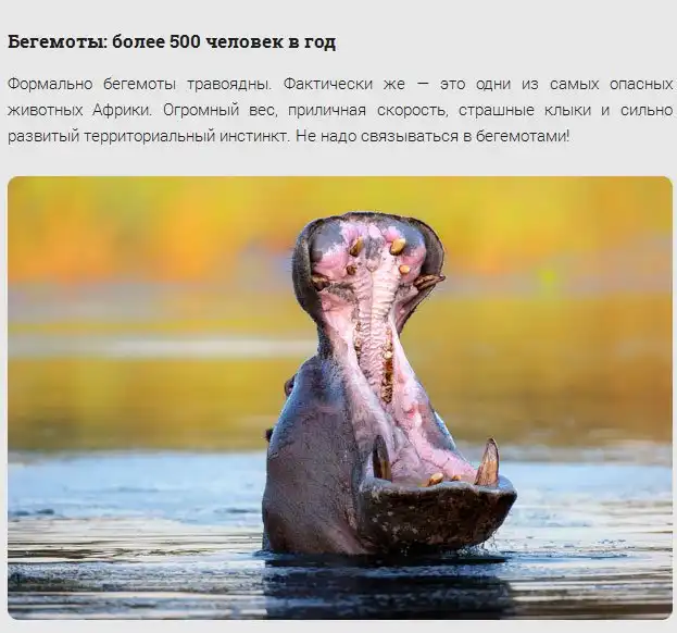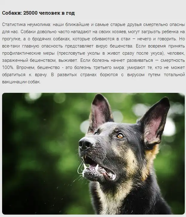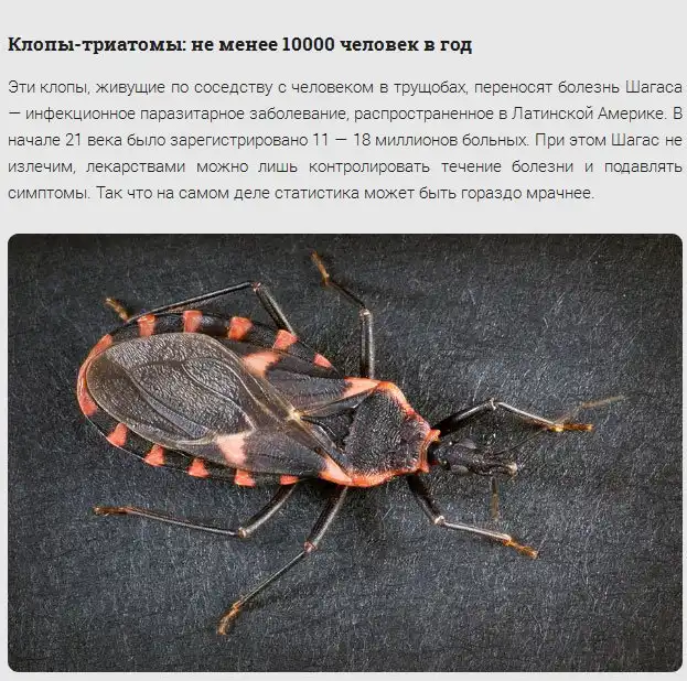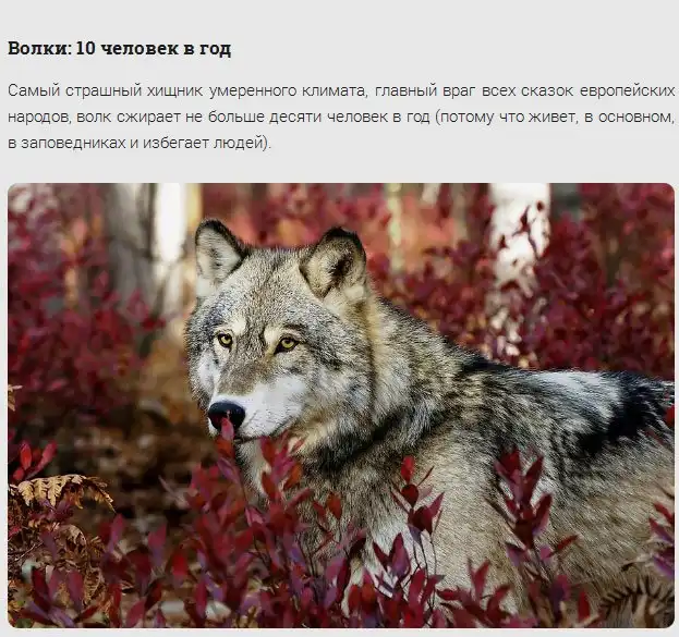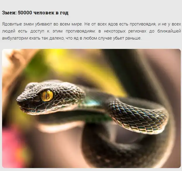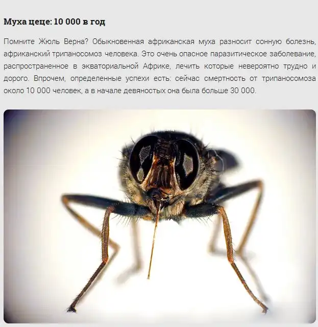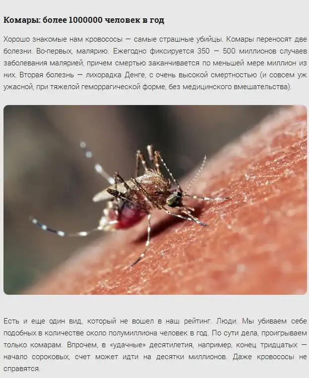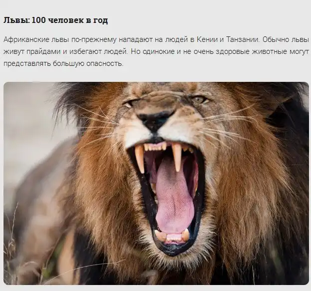 Человек давно уже подчинил себе животный мир, однако в странах третьего мира ежегодно от диких животных гибнут люди. Но, как показывает статистика, большинство человеческих смертей приходится не на крупных животных, а на насекомых и прочие, еще более примитивные, организмы.