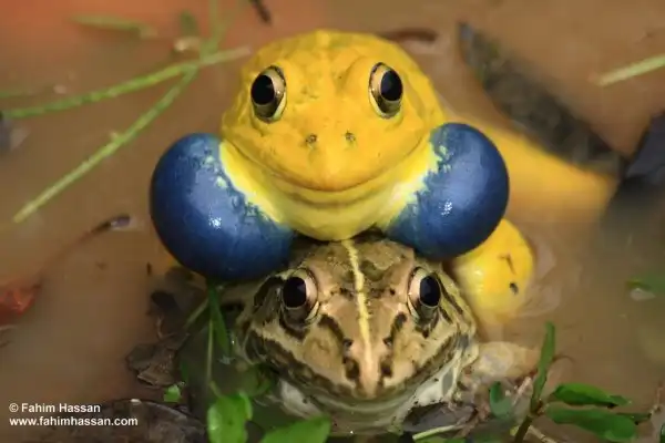 Тигровая индийская лягушка – распространена во влажных районах Пакистана, Индии и ближайших азиатских государств. Обычно эти амфибии имеют серо-коричневый окрас, живут поблизости с пресными водоемами. Днем прячутся в норках или кустах, а ночью охотятся – они очень прожорливы и глотают все, что движется, вплоть до мышей, птенцов и мелких змей. Когда наступает сезон спаривания, вместо обычного скучного земноводного вдруг появляется яркая желтая лягушка. Они меняются до неузнаваемости, лягушачья кожа становится цвета охры, кроме того по бокам раздуваются два синих горловых мешка.