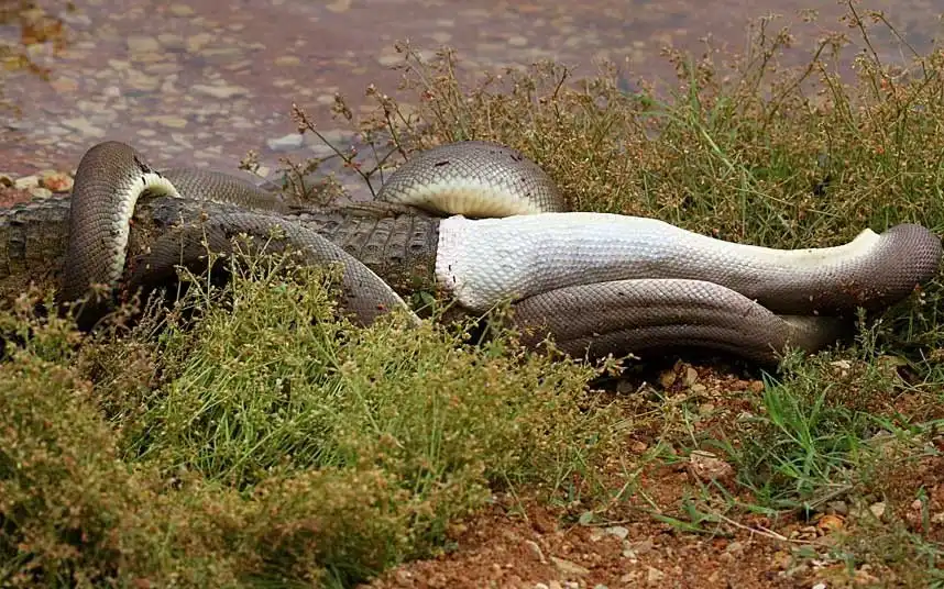 Змея – питон длиной около 3 метров –перед тем, как притащить крокодила на берег, чтобы съесть, удушила его, перед толпой шокированных зевак.