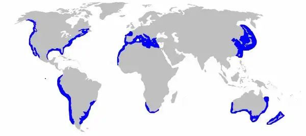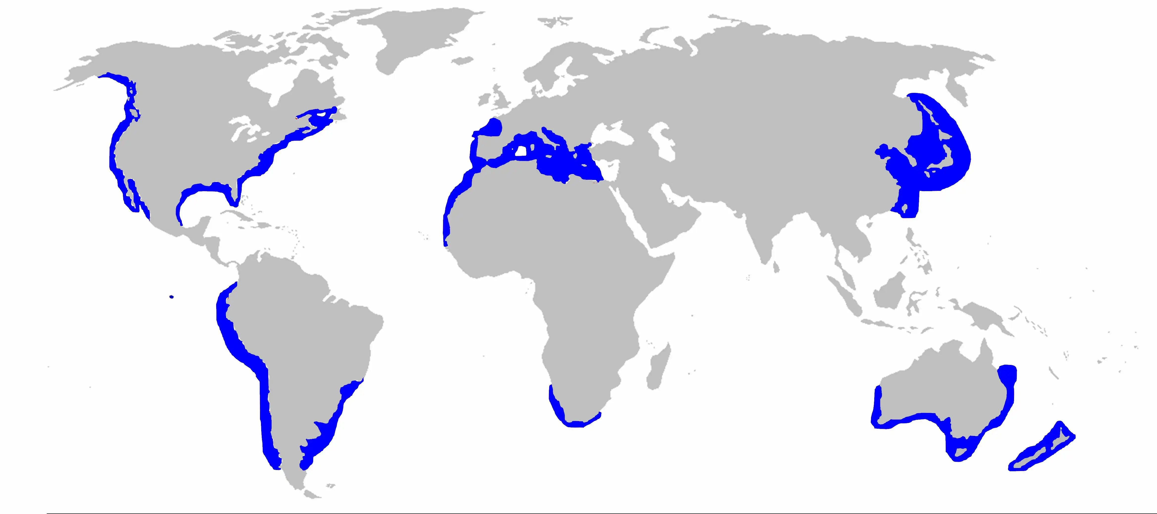 Ареал обитания большой белой акулы охватывает многие прибрежные воды теплых и умеренных морей Мирового океана. На приведенной карте видно, что встретить ее можно в любой точке среднего пояса океанов планеты, кроме, разумеется, Северного Ледовитого.
