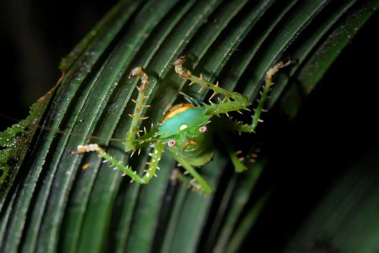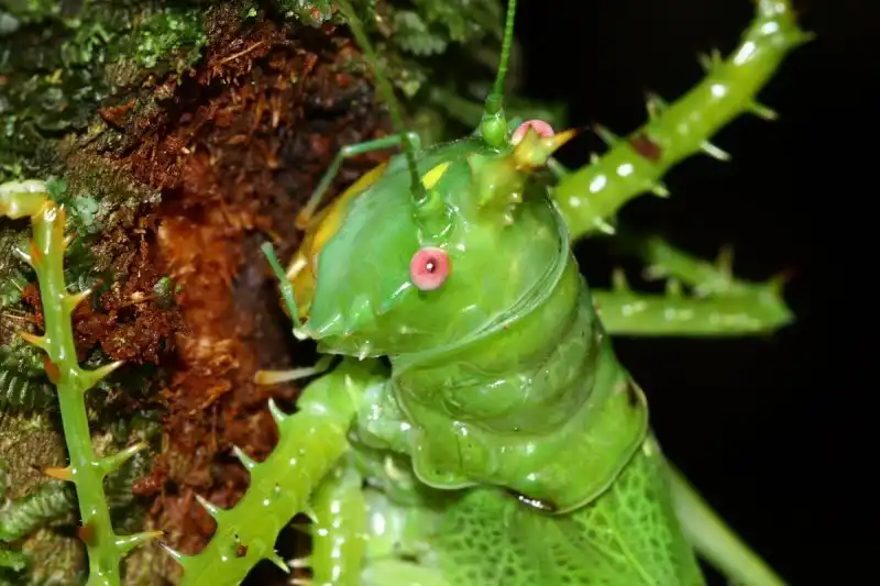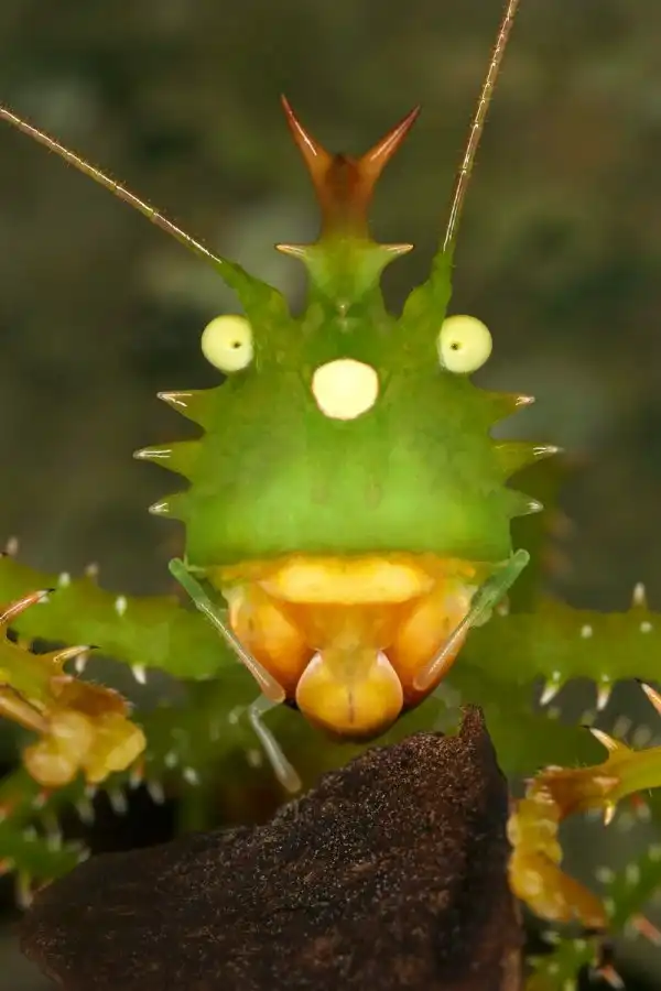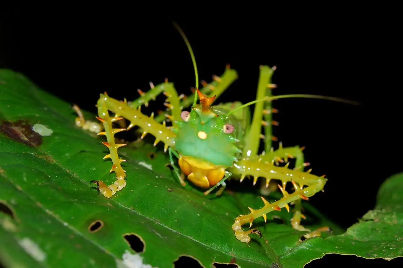 Иглистый дьявол (Panacanthus cuspidatus) — такое зловещее название этот кузнечик получил благодаря относительно крупным и острым шипам, покрывающим почти всё его изумрудно-зеленое тело.