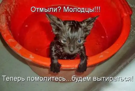 Ходит мнение, что мыть кошек необязательно. Говорят, что кошки сами себя вылизывают. Знающие люди говорят также, что их слюна содержит специальные вещества (энзимы), которые действуют наподобие рекламируемых по телевизору моющих средств - уничтожают не только грязь, но и бактерии, причем в самых труднодоступных местах…