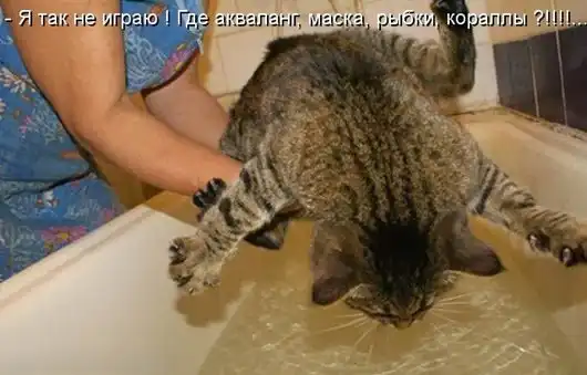 Коты не боятся воды, просто им намного больше удовольствия доставляет наблюдать за водными процедурами других активистов. В редких случаях коты по собственному желанию прыгают в воду: охота на рыбу, на дичь, спасение от врагов. Коты рыболовы или виверровая порода кошек требует особенных условий содержания, среди которых доступ к водному резервуару с рыбой, чтобы кот не потерял природных навыков охоты (в природных условиях виверровые коты-рыболовы питаются рыбой, лягушками, улитками, раками). Сиамские коты тоже не прочь поплавать в комфортных условиях это известно с давних времен правления королей. В природных условиях коты не купаются, чтобы очистится от грязи, откуда же им взяться любви к воде? Владельцы насильно купают своих домашних питомцев, якобы делая благо. Некоторые особенности кошачьей жизни с хозяевами требуют подчинения: купание после прогулки, купание перед выставками, купание после визита к ветеринару и т.д. В добавок ко всему, моют котов ароматизированными шампунями, мылом и кондиционерами, но это котам не надо.