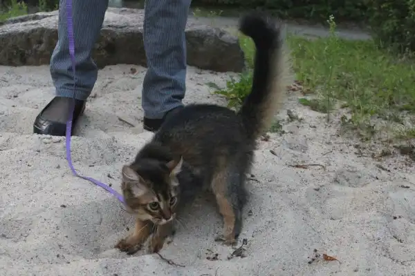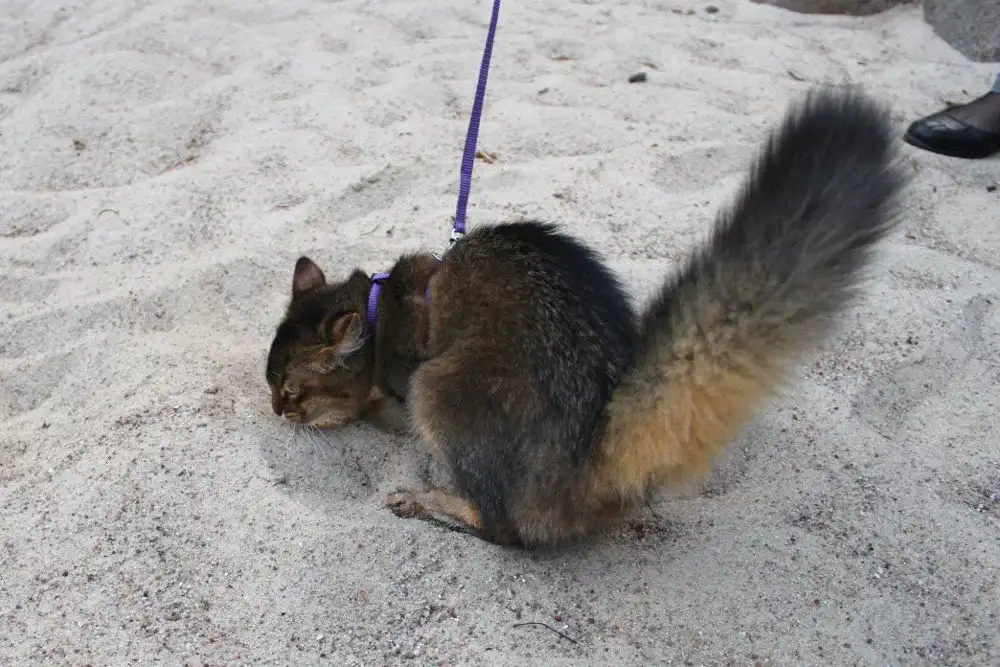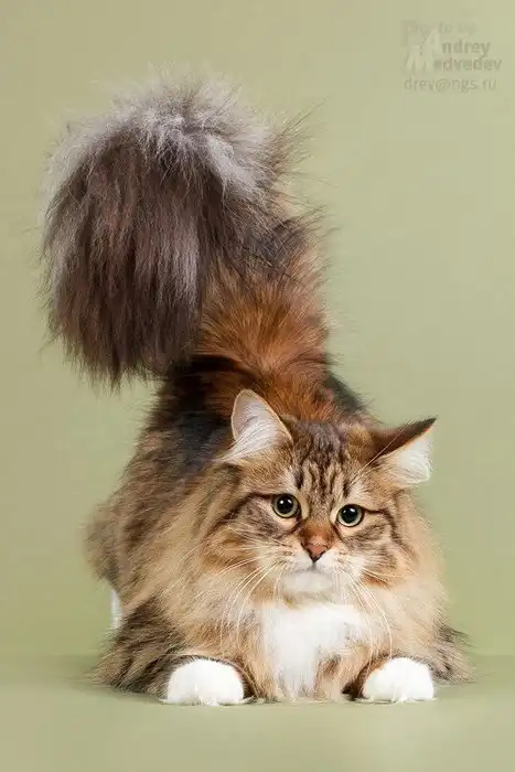 Недавно была на выставке кошек и на всякие породы насмотрелась. Но котов с беличьими хвостами не видела. Не удивлюсь, если этот кошак легко прыгает с ветки на ветку и питается орешками. Наверное поэтому хозяин посадил его на поводок.