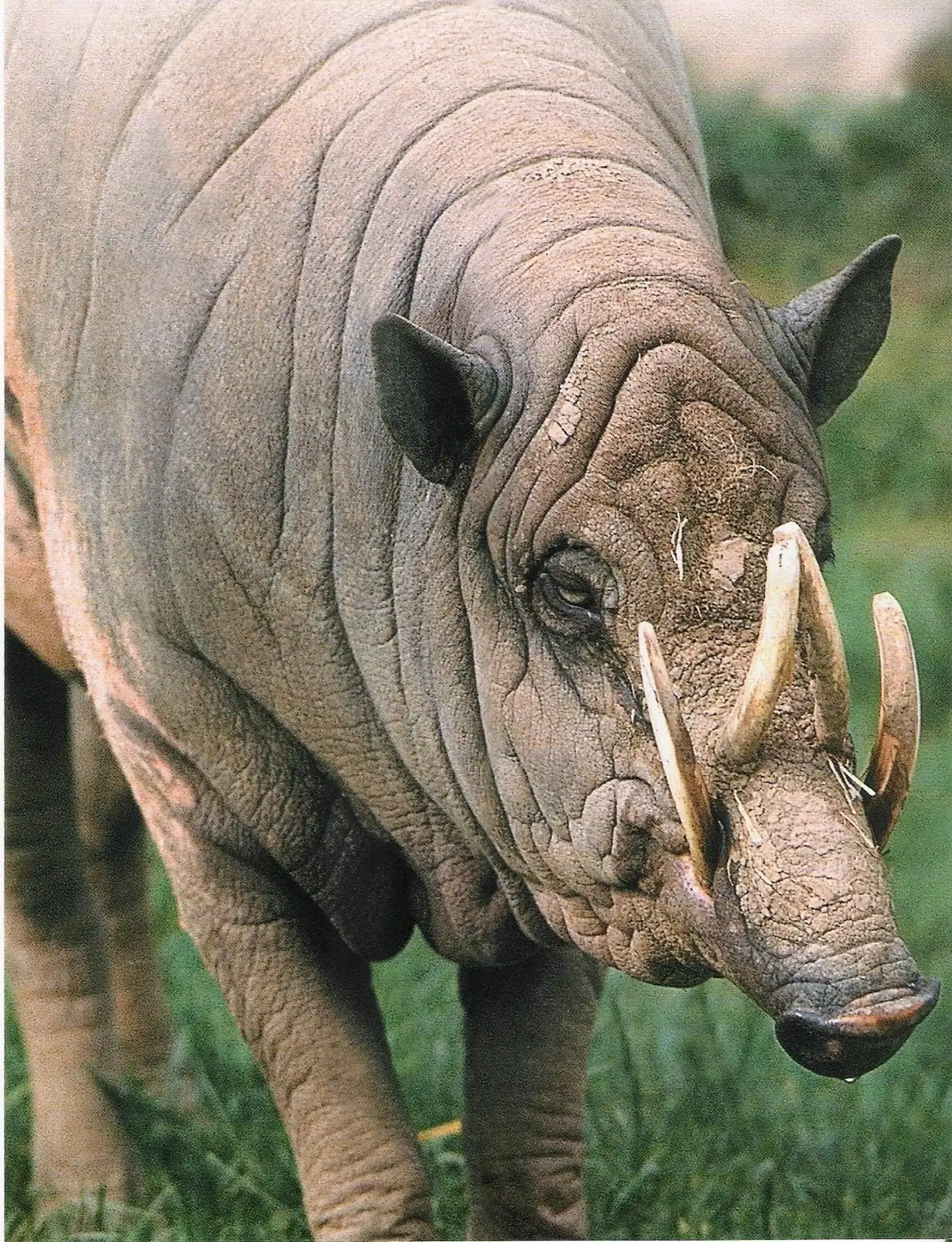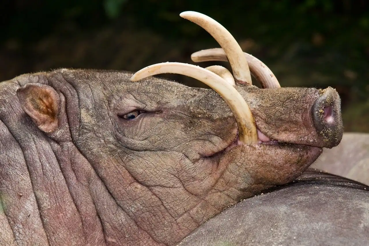 Даже внешне эта свинья резко отличается от своих сородичей по семейству. Посмотрите на снимок. У нее маленькие стоящие уши, морщинистая кожа почти лишена щетины. Правда, именно по размерам, окраске и густоте щетины ученые выделяют среди бабирусс четыре подвида. У животного странные, серого цвета глаза, резко выдвинута вперед верхняя часть морды и четыре огромных загнутых клыка.