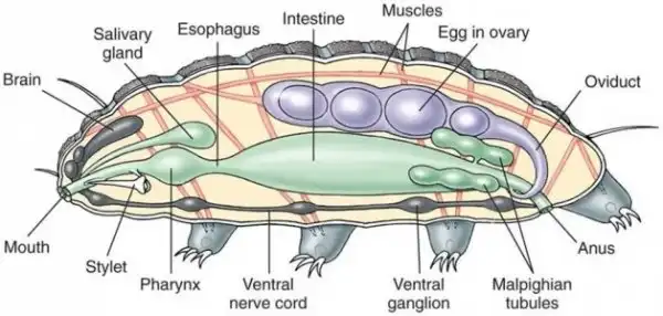 Тело у тихоходок (или их еще называют водяной медведь) имеет размер 0,1—1,5 мм, полупрозрачное, из четырех сегментов и головы. Снабжено 4 парами коротких и толстых ног с 4—8 длинными щетинковидными коготками на конце, причем последняя пара ног направлена назад. Передвигаются тихоходки действительно очень медленно — со скоростью всего 2—3 мм в минуту. Ротовые органы — пара острых стилетов, служащих для прокалывания оболочек клеток водорослей и мхов, которыми тихоходки питаются. Тихоходки имеют пищеварительную, выделительную, нервную и половую системы; однако у них отсутствуют дыхательная и кровеносная системы — дыхание кожное, а роль крови выполняет заполняющая полость тела жидкость.