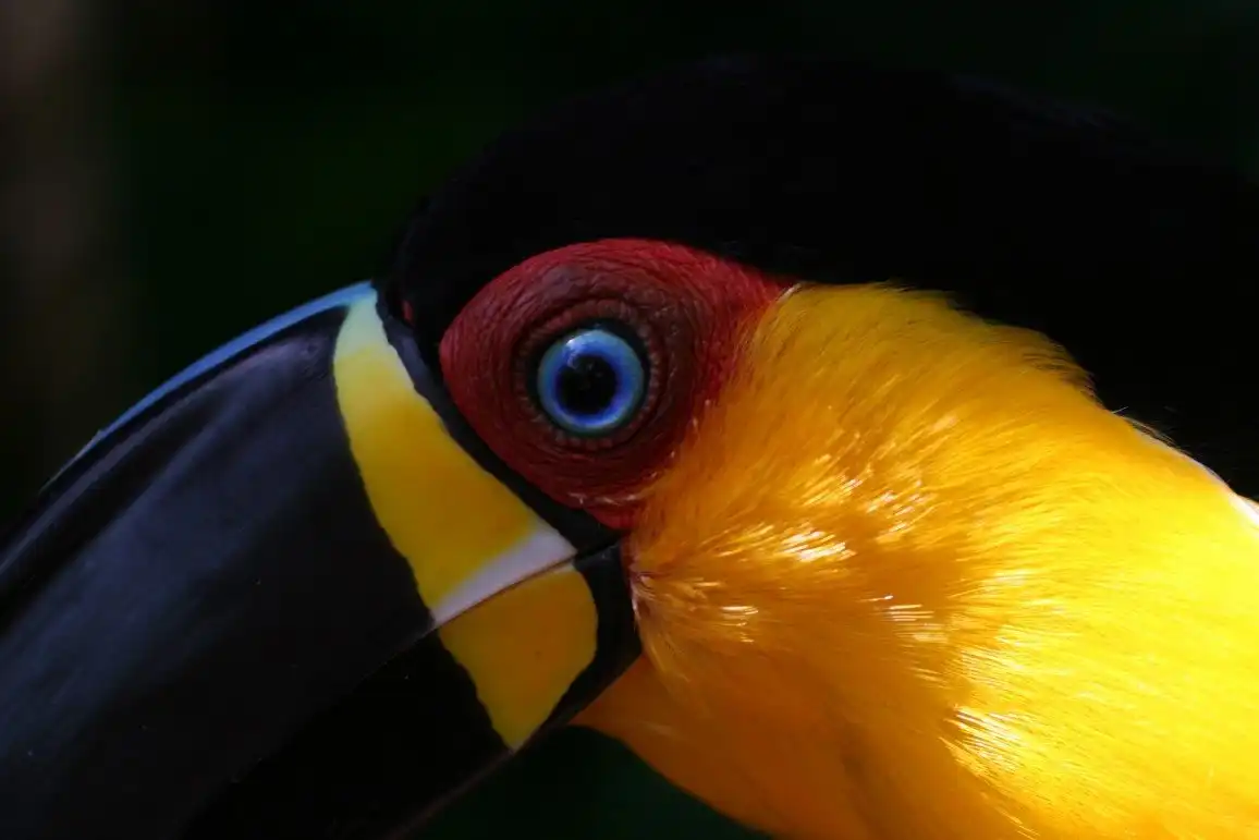 Но не менее красивое и оперение большого тукана: он словно бы одет в строгий деловой костюм. Тело птицы черное, а грудь, воротник и верхняя часть хвоста белые, что придает токо довольно импозантный вид. Нижняя часть хвоста окрашена в красный цвет, вокруг глаз тонкая голубая кожа, окруженная более плотной оранжевой – ну чем не солидные очки!