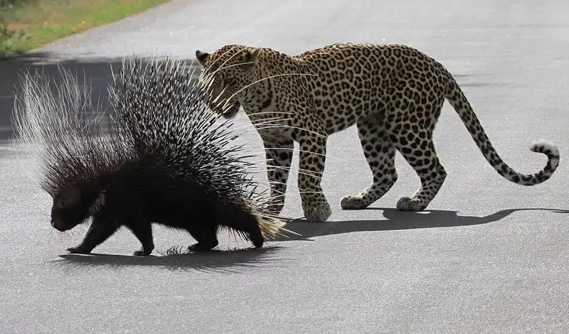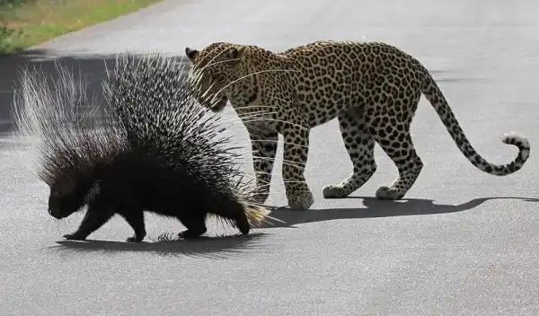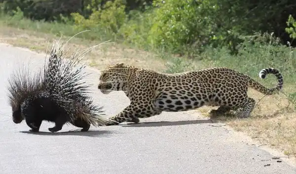 Леопард отдыхал на дереве возле дороги в национальном парке Крюгера в Южной Африке, когда появился дикобраз. Леопард захотел полакомиться свежей дикобразинкой, но после ряда попыток атаковать, он лишь получил несколько иголок в нос и лапы, и убрался ни с чем. Эти кадры снял Yusuf Chavoos, когда ехал по дороге через парк.