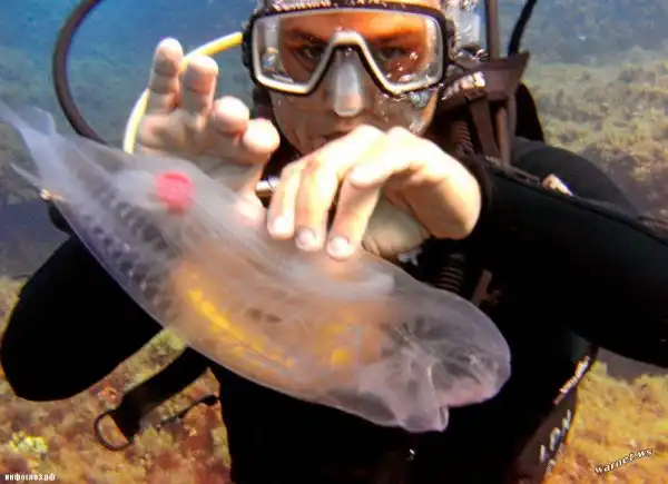 Салпа питается в основном планктоном, поэтому совершенно безопасна для человека. Её прозрачное тело — это всего лишь способ защиты от хищников. На ощупь рыбка напоминает слегка отвердевшее желе. Снаружи это морское существо напоминает скорее стеклянную фигуру, а не животное. Природа удивительна!