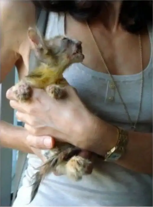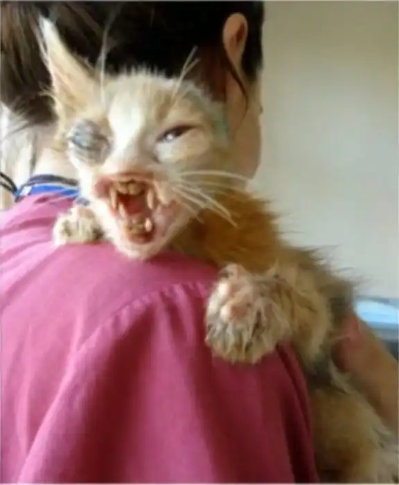 Этот крошечный котенок в таком ужасном состоянии был обнаружен 7-летней девочкой на мусорке в Стамбуле. Животное находилось практически при смерти, но маленькая спасительница отнесла его к своему отцу, работавшему доктором. Несколько недель медсестры долгое время выхаживали потрепанного другими уличными кошками котенка и избавляли его от паразитов в виде личинок, клещей, блох и вшей. Медперсонал даже дал котенку прозвище «та, которая всегда улыбается». В настоящее время котенок заметно подрос и полностью восстановил свое здоровье, а о прежнем его состоянии сейчас напоминают только шрамы на мордочке и отсутствующее левое ухо.