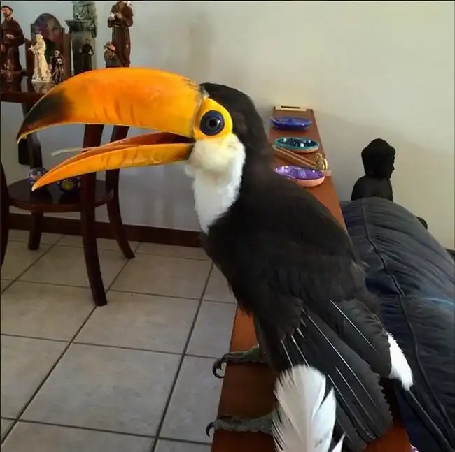 Это птенец тукана. Птица широко распространена в тропических лесах Центральной Америки, а также встречается в некоторых странах Южной и Северной Америки. Туканы всеядны, но предпочитают употребл*ть в пищу свежие плоды. Могут также питаться насекомыми, яйцами других птиц или даже ящерицами. А вы бы рискнули завести такую птицу у себя дома?