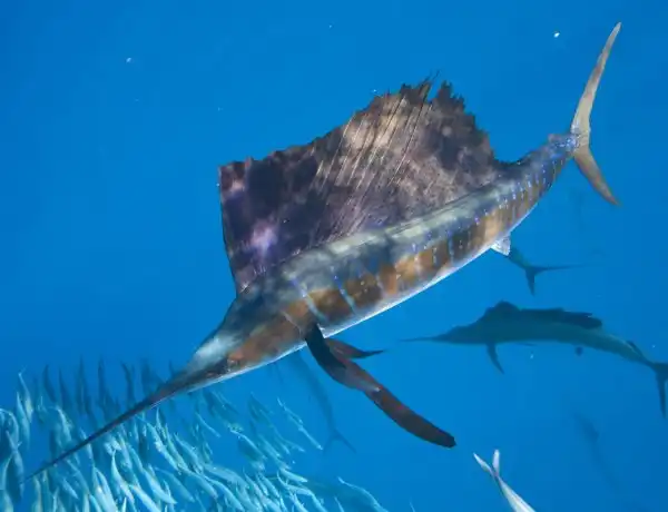 Размеры Парусника могут превышать три метра, а вес – около ста килограмм. Главная отличительная особенность самой быстрой рыбы в мире – большой спинной плавник похожий на парус.