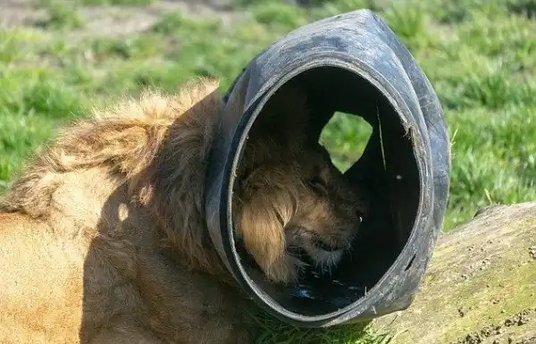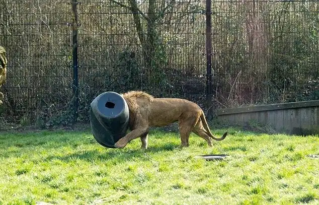 Сотрудники голландского зоопарка складывают еду для львов в бочки, чтобы сымитировать трудности, с которыми сталкиваются животные в дикой природе во время охоты. Однако, в природе пластиковых бочек не бывает, поэтому лев, чья голова застряла в дырке, пришел в полное замешательство. Он начал просто нарезать круги по вольеру, в то время как его сотоварищи пристально за ним наблюдали. В итоге льва удалось освободить из западни работникам зоопарка - животное никоим образом не пострадало.
