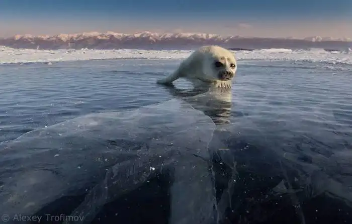 Обитающие на Байкале пресноводные тюлени нерпы, а точнее их детеныши представляют собой большую ценность для фотографов. Мало кому удавалось увидеть белька, детеныша нерпы, вблизи. Для того чтобы сделать несколько снимков этого симпатичного белого млекопитающего с большими черными глазами фотограф-пейзажист Алексей Трофимов в компании проводника несколько часов провел, блуждая по льду. Только благодаря везению и погодным условиям ему удалось запечатлеть выползшего на поверхность белька.