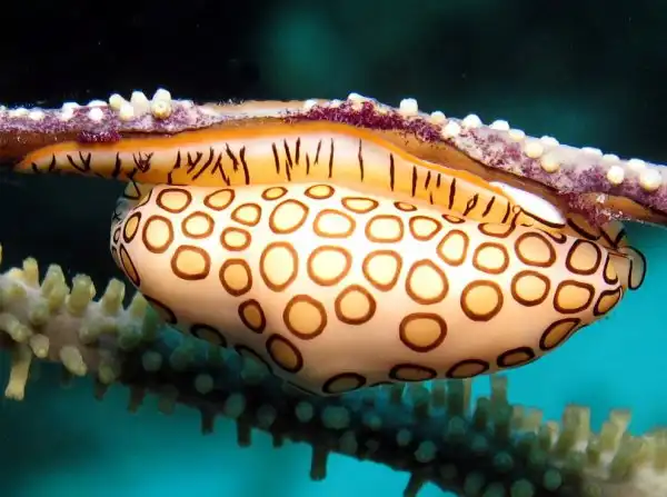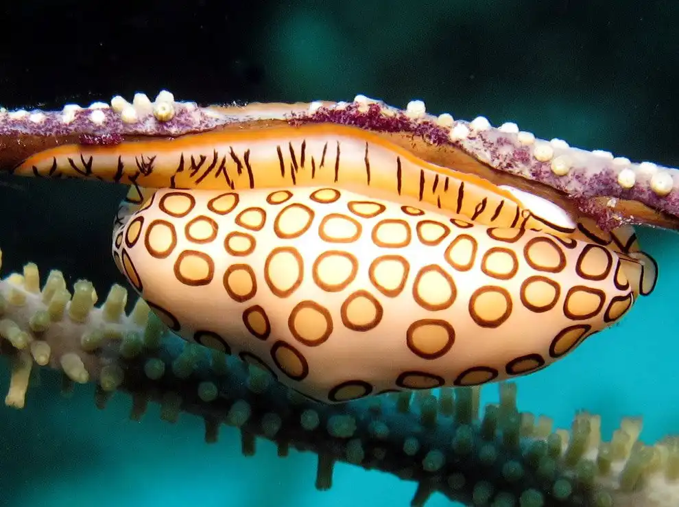 Окрас раковины этой оранжево-желтой улитки кажется очень ярким. Однако такой цвет имеют только мягкие ткани живого моллюска, а не раковина. Обычно улитки Cyphoma gibbosum достигают 25-35 мм в длину, а их раковина — 44 мм.