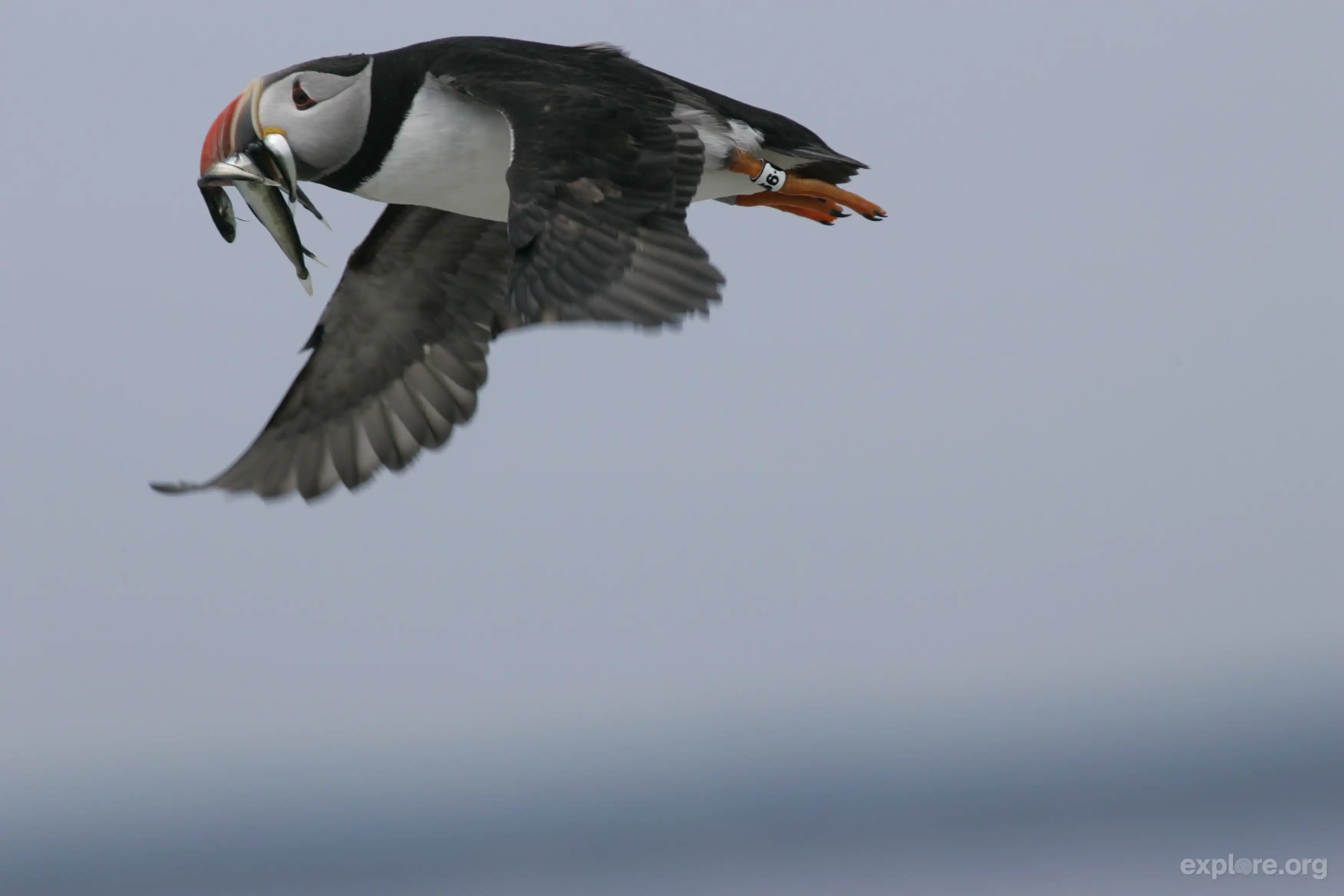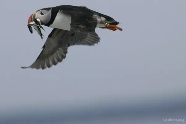 Возвращаясь с охоты, топорик несет в клюве одновременно несколько рыбок. Средний улов обычно составляет 10 – 12 мелких рыбешек, но известен случай (в штате Мэн), когда заботливый отец принес в клюве 62 рыбы. Пока птица плывет под водой, открывая клюв для новой добычи, ее шершавый язык прижимает уже пойманную рыбу к специальным выростам на нёбе.