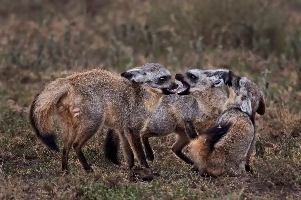 Только маленькая ночная лисица фенек, живущая в пустыне Сахаре, может похвастаться еще более непропорциональными размерами ушей. Большеухая лисица – единственная представительница обширного семейства Псовых, которая предпочитает насекомых привычной мясной диете хищников. За долгие годы эволюции ее зубы видоизменились, став маленькими и слабыми и приспособившись к менее жесткой пище, чем мясо и кожа млекопитающих.
