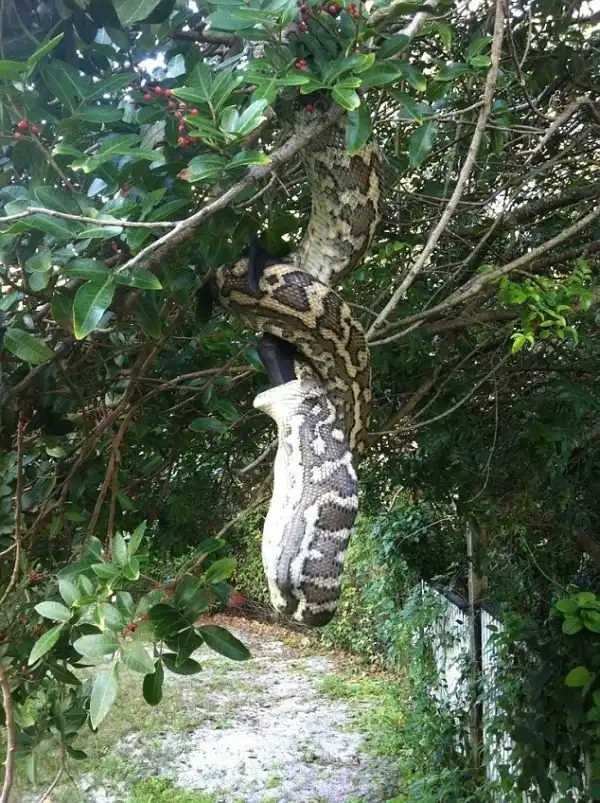 Жители Австралии давно уже привыкли к встрече с различными дикими животными на территории своих домов, однако, то, что недавно увидела на своем заднем дворе одна семейная пара из штата Квинсленд, повергло в шок многих пользователей сети. Милле и ее муж Штейн стали невольными свидетелями получасовой трапезы 3-метрового питона, поймавшего большую летучую мышь. Рептилия медленно заглатывала свою добычу, а люди не стали ей мешать. После того, как бедное животное было полностью проглочено, змея еще немного повисела на дереве, а потом быстро скрылась в кустах.