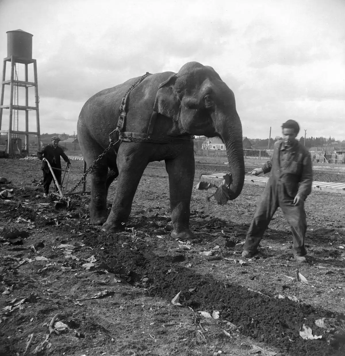 Слон Малыш из цирка Роберта Фоссета вспахивает землю неподалёку от Таустера, в северной Англии, 1939 год.