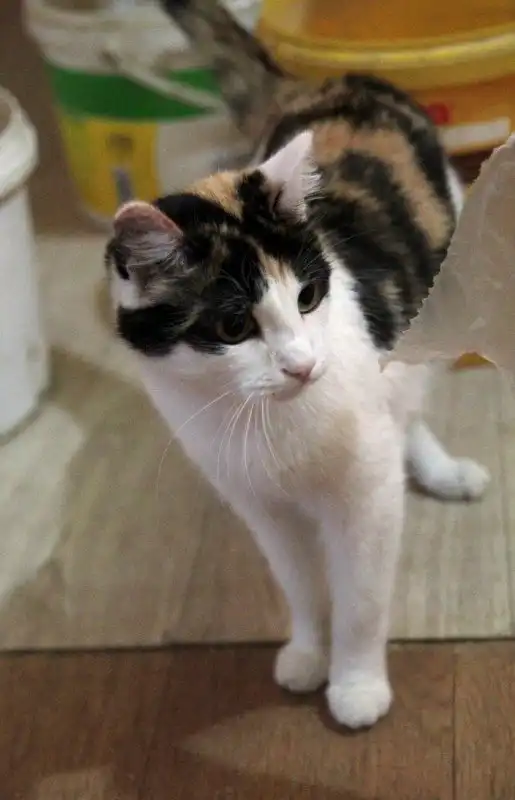 Фэнси - молоденькая кошечка трехцветного окраса, фон белый. Ей примерно 1 год. Крупненькая для своего возраста. Очень симпатичная мордочка, как у игрушки. С людьми адекватна, на ласку реагирует, но ненавязчива, может существовать параллельно. Хорошо уживается с другими кошачьими. Питается готовыми кормами, пользуется лотком. Стерилизована.