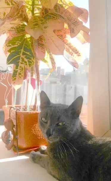 Цвет "мокрый асфальт" с платиновым отливом. Глаза-хамелеоны (то желтые, то бирюзовые). Умеет философски молчать, жалобно мяукать и уютно мурчать. Во сне не храпит, кушает с аппетитом, гладится с удовольствием.