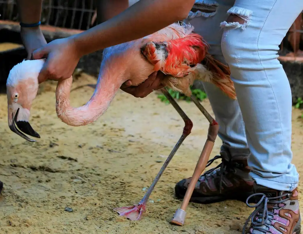 Фламинго в зоопарке бразильского города Сорокаба сломал ногу. Из-за риска риска инфекции, врачи приняли решение её ампутировать. После удачно проведённой операции, птица получила специально сконструированный протез, благодаря которому, она снова может гордо расхаживать перед посетителями зоопарка.