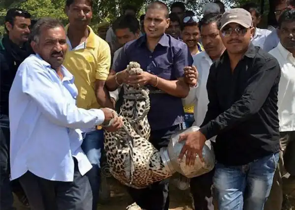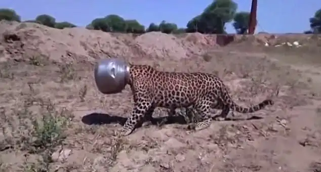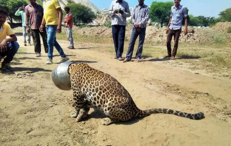 Курьезный случай произошел в одной из индийских деревень в штате Раджастан. Самец леопарда застрял головой в металлическом горшке, попытавшись из него напиться. Животное слонялось по поселку не меньше шести часов в ожидании спасателей, веселя местных. Позже хищника удалось освободить и выпустить на волю.