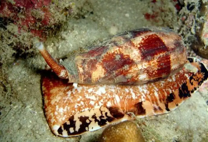 На первый взгляд улитка географический конус (Conus geographus) может показаться красивым и безобидным подводным моллюском, но это совсем не так. Эту улитку считают самой опасной в мире, а виной всему ее яд, с помощью которого она охотится на рыб и других морских обитателей. Днем улитка покоится на дне, зарывшись в ил или песок, а по ночам она начинает охотиться. Обнаружив спящую рыбу, улитка выпрыскивает на нее яд, парализующий жертву, после чего не спеша заглатывает обездвиженную добычу целиком. Улитка способна проглотить даже довольно крупную по сравнению с собой рыбу, а за свой метод охоты она получила прозвище «тихий убийца».
