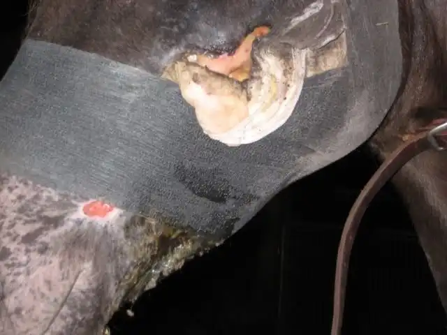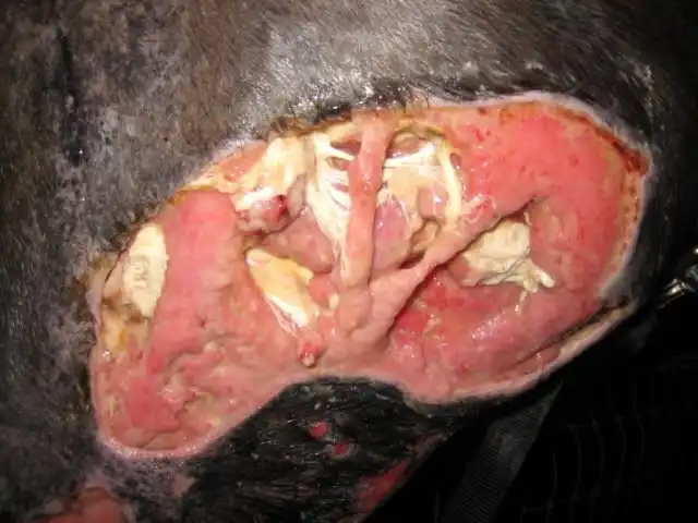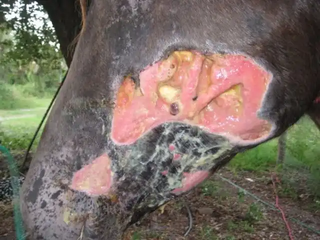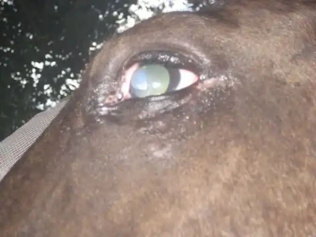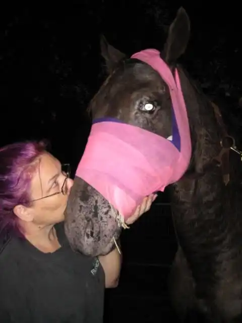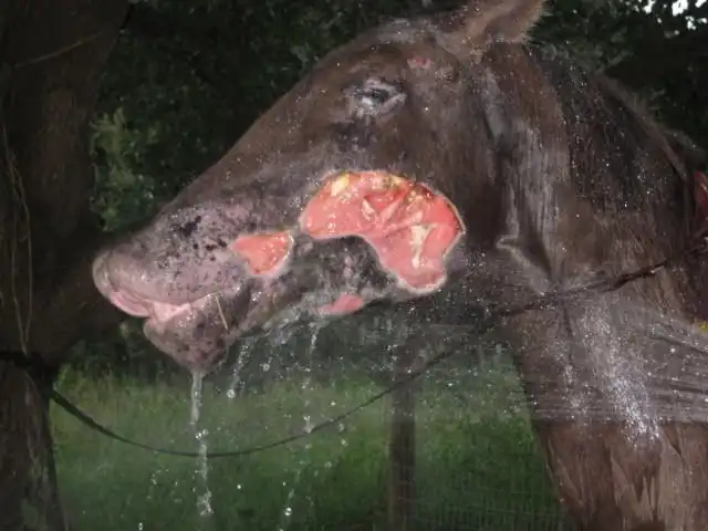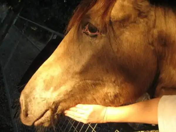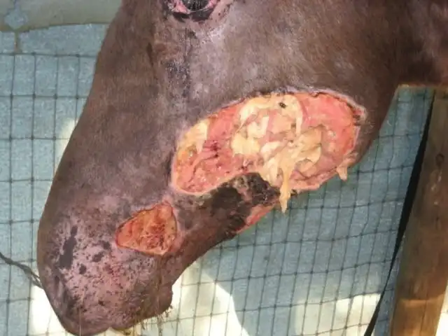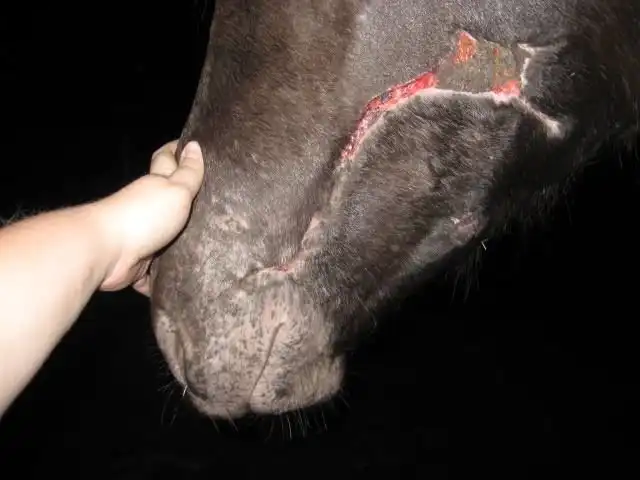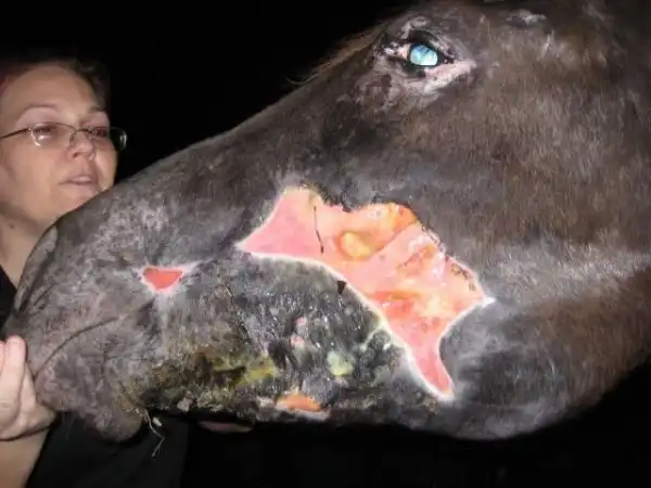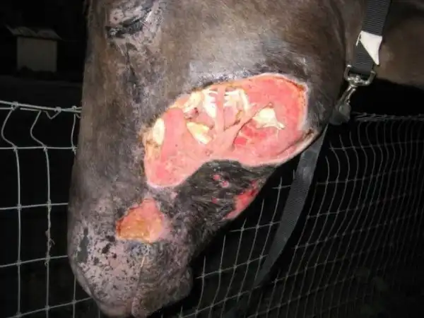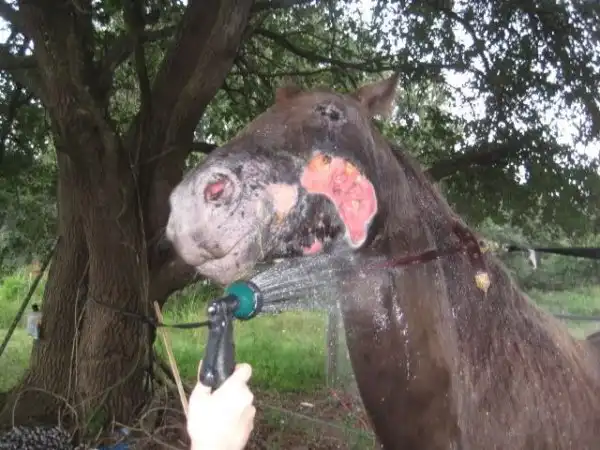 Этой милой лошадке крупно не повезло - ее ужалил за морду карликовый гремучник. Яд этих змей из семейства гадюковых славится некрозом тканей, которые он вызывает. Несмотря на то, что ветеринар ввел противоядие довольно своевременно, животному все равно пришлось тяжко.