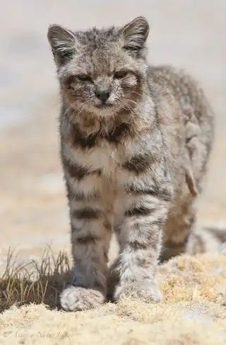 Окрас у южноамериканской кошки песочно-серый: на этом фоне контрастно выделяется хаотичная россыпь черных пятен, которые на спине сливаются в отчетливые продольные полосы. Большую круглую голову венчают чутко стоящие уши с особой меткой – большими белыми пятнами на черном фоне с тыльной стороны. Маскировочный «прикид» помогает кошкам в выслеживании добычи – грызунов, насекомых, рептилий, птиц.