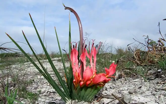 Растение из ЮАР, часто именуемое как крысиный хвост, специально для удобства опыляющих его птиц, вырастило жесткий вертикальный ствол. Птица садится на ствол, свешивается вниз головой, чтобы попить нектар, и попутно опыляет цветок. Необычное эволюционное нововведение связано с тем, что птицы боятся приближаться к земле, опасаясь хищников. А полностью зависящие от птиц-опылителей растения постарались сделать опыление для птиц максимально комфортным. С чем они и справились блестяще.