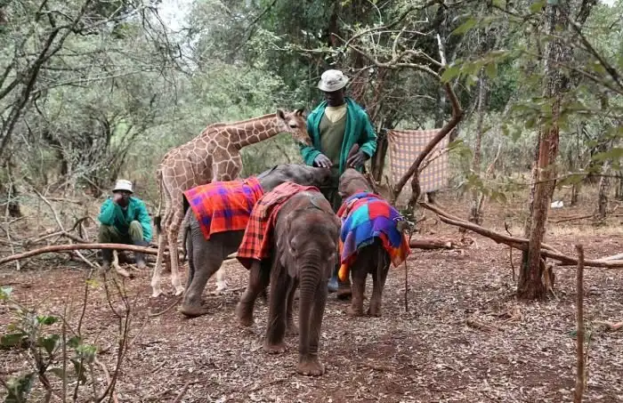 Кенийские зоозащитники нередко находят осиротевших детенышей диких животных, матерей которых убили браконьеры. Если малыши не могут выжить в естественной среде обитания, то их забирают в национальный парк Найроби, где за ними присматривают члены приюта для диких животных David Sheldrick Wildlife Trust Orphanage. На попечении у приюта находятся десятки детенышей и почти все они прекрасно ладят между собой. Животные быстро привыкают друг к другу, а некоторые из них даже завязывают настоящую дружбу. Именно это и произошло с 4-недельным жирафом Кико и 3-недельным слоненком Лобоито, ставшими неразлучными друзьями и проводящими все свое время вместе.