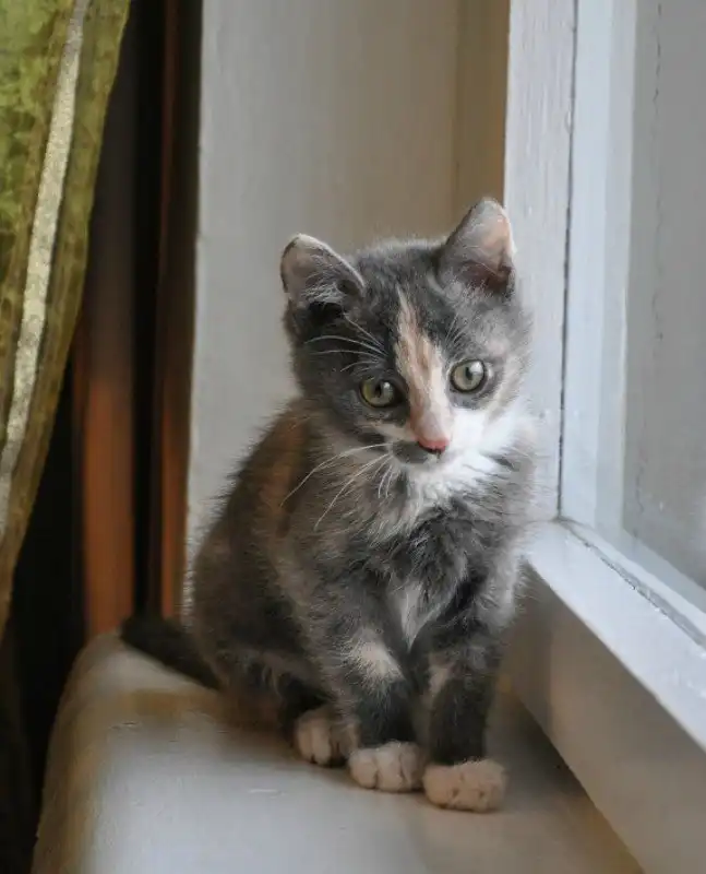 Окрас у Кнопы черепаховый, серый с кремовым и белым, глаза зеленые, гладкошерстная. По характеру очень игривая, шустрая, самостоятельная. Кушает натуральный корм, пользуется лотком с наполнителем. Отдается ответственным людям с постоянным местом жительства! Доставка, испытательный срок.