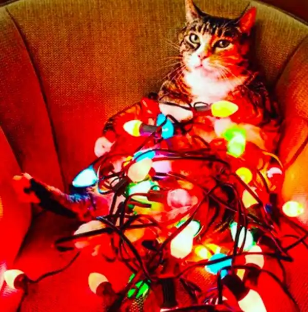 Интернет-пользователи в преддверии Нового года выкладывают в соцсети фотографии котов, наряженных в елочные игрушки и гирлянды, с хештегом #котоелка.