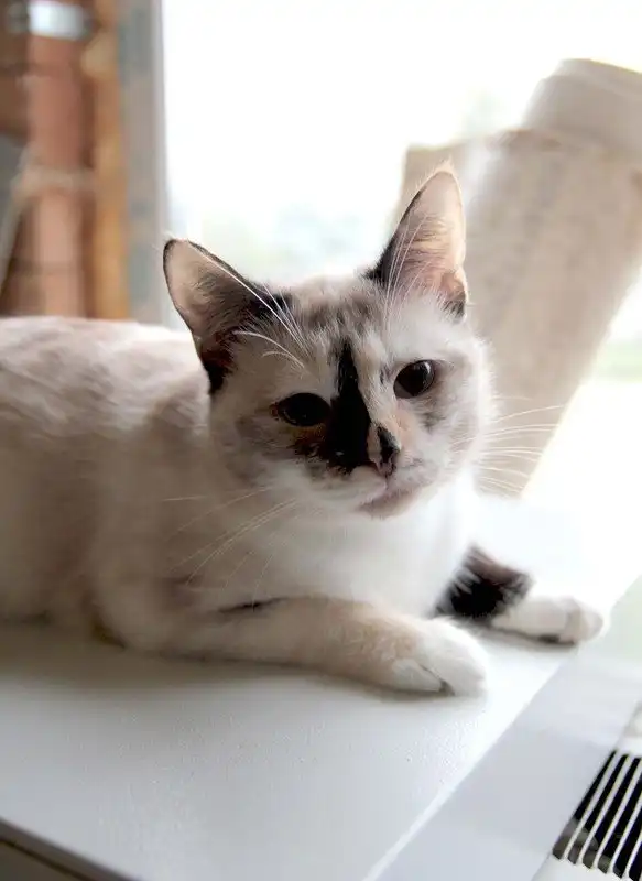 Мозаика - милая миниатюрная кошечка, помесь с пойнтовыми, расположение темных пятнышек совершенно невероятное. Возраст кошечки 1,5-2 года. Доброе, ласковое животное, немного побаивается новых знакомых. Отлично ладит с другими кошачьими. Питается готовыми кормами, пользуется лотком. Стерилизована.