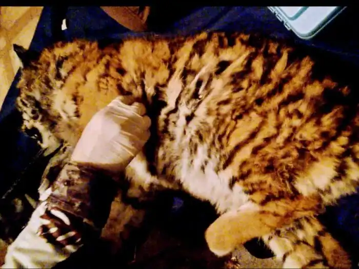 В ночь на 29 декабря в Приморье был найден четырехмесячный тигренок, которого чуть было не загрызли собаки. Животное находилось в крайней степени истощения и, по мнению специалистов, не ело около трех недель. На хищника набросились собаки одного из местных жителей, однако, он их отогнал и сообщил о находке в заповедник «Земля леопарда». Малыша доставили в центр реабилитации, где он пошел на поправку. Тигренок уже хорошо питается и ходит в туалет, у него не найдено никаких заболеваний, но специалистов беспокоит практически полное отсутствие подкожного жира и плохое состояние шерсти. Маленькая самка весит 19 кг вместо положенных в ее возрасте 27 кг и находится под пристальным вниманием ветеринаров.