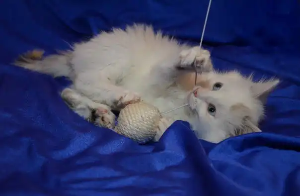 1. Атос - пушистый белый с черными пятнами котик. Вырастит крупным котом. Ласковый и ручной, имеет характер, любит сидеть на руках и коленках.