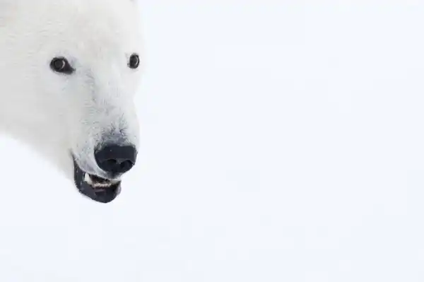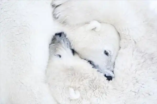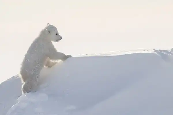Белые медведицы знают, когда на дрейфующих льдах Гудзонова залива тюлени рожают своих детёнышей. Это лёгкая добыча. Но созерцать выход медведей из берлоги крайне сложно и это редко удаётся, ведь фотограф сталкивается с крайне трудными условиями.