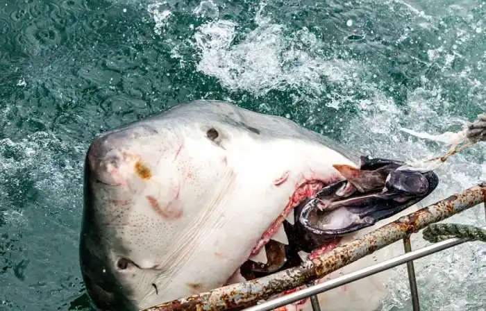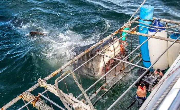 Свежие фотографии гигантской белой акулы недавно были сделаны у побережья Южной Африки. Хищница заплыла в эти воды, чтобы поохотиться на тюленей, однако здесь ее поджидал фотограф с приманкой. Находящийся в защитной клетке фотограф сумел сделать серию снимков акулы с очень близкого расстояния.