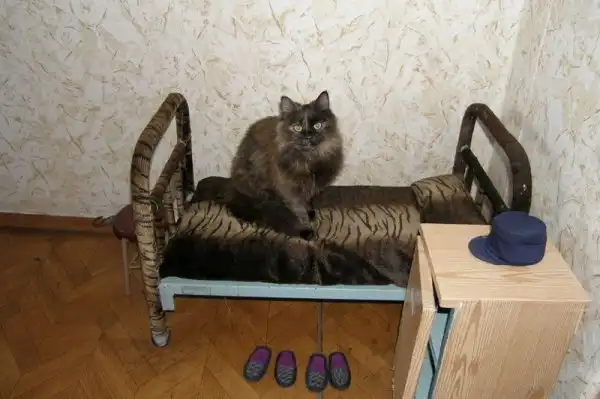 В одной из колоний под Нижним Новгородом в бараке обустроено место для местного кота. Всё как положено: койка, тапочки на 4 лапы, табурет и головной убор. В тумбочке есть какой-то кошачий скарб. За что сидит – не знаю.
