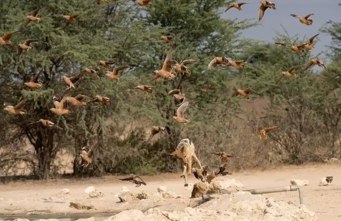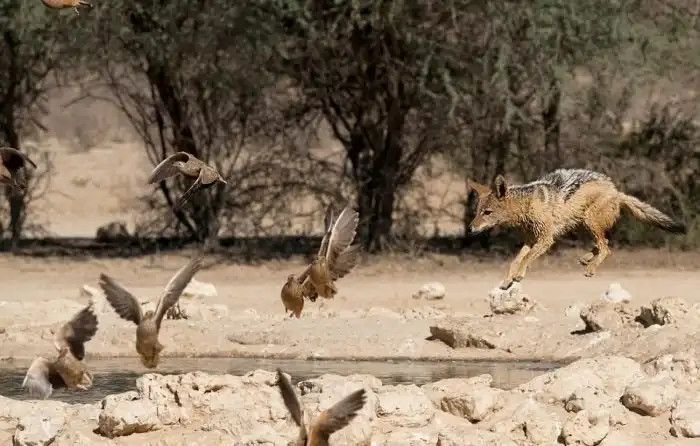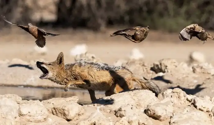 Путешествуя по Южной Африке, фотограф из Дании Аннет Лаурсен (Annette Laursen) сделала замечательные кадры шакалов, охотившихся на рябчиков. Пара хищников устроила засаду у источника, к которому стая прилетела попить воды. Шакалы ловко взмыли в воздух и сумели поймать не слишком расторопную птицу, с которой они расправились меньше чем за минуту, после чего стали сушиться под лучами жаркого солнца.