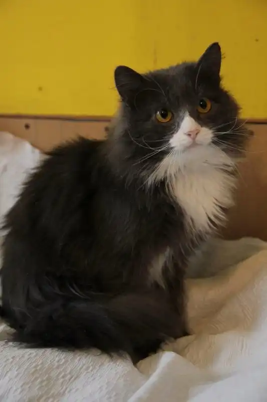 Георгий - крупный пушистый кот голубого окраса с белым носом и в белых тапочках. Найден на улице. Возраст примерно 2 года. Спокойный, рассудительный кот, от внимания к себе не отказывается, может и поиграть, и побегать, но сам инициативы не проявляет. Не очень доволен, если рядом оказывается другой кот, но агрессии не проявляет. Питается готовыми кормами, пользуется лотком. Кастрирован.
