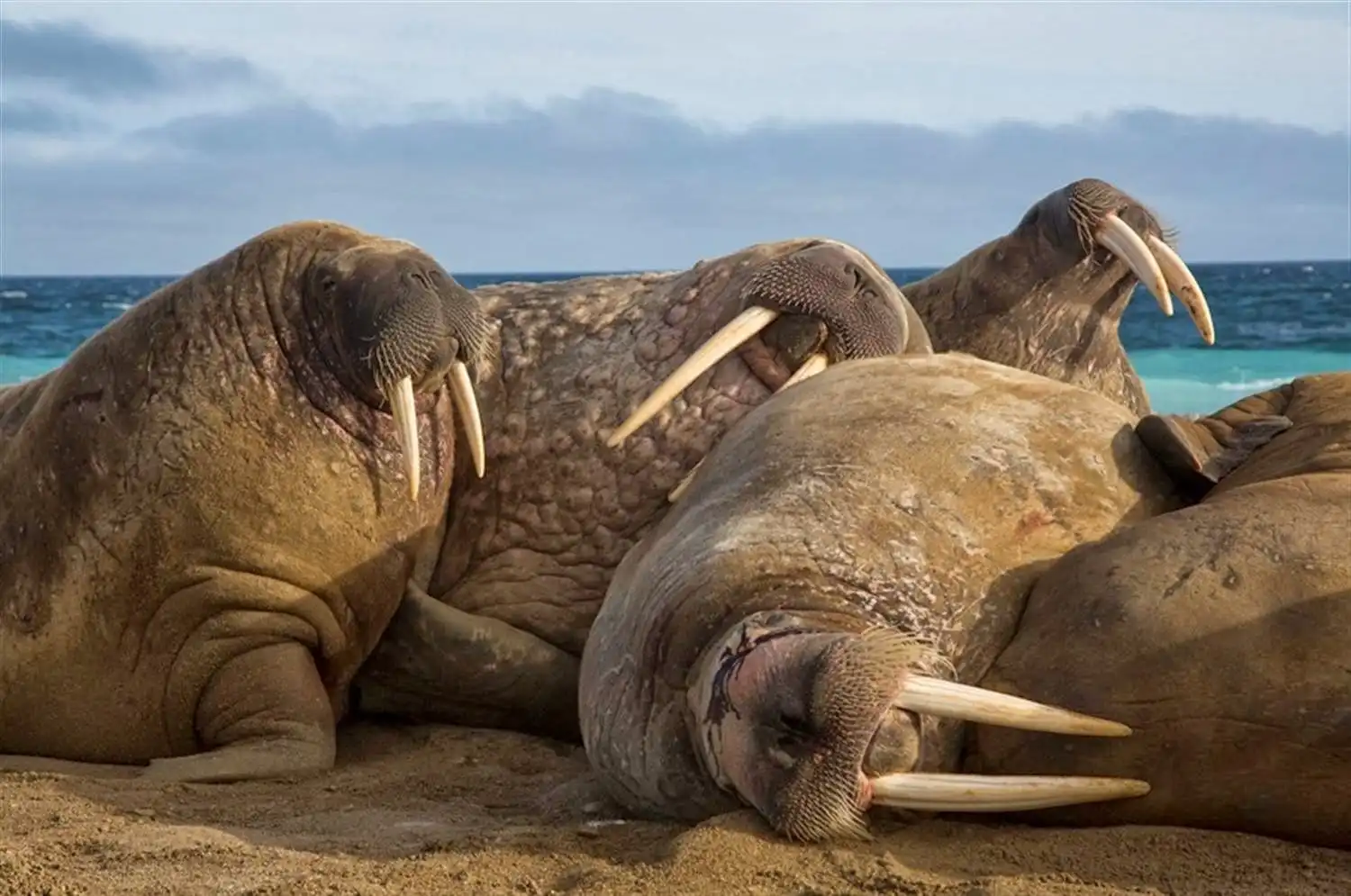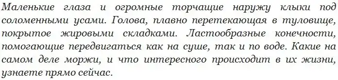 Усы моржей, расположенные над верхней губой, на самом деле являются вибриссами. Этот чувствительный орган помогает животному искать себе еду и ориентироваться на дне морском. Помимо этого моржи способны замедлять свой ритм сердца, чтобы организм выдержал низкую температуру воды. С этой проблемой морскому «толстяку» помогает справиться слой жира, достигающий 15 сантиметров.