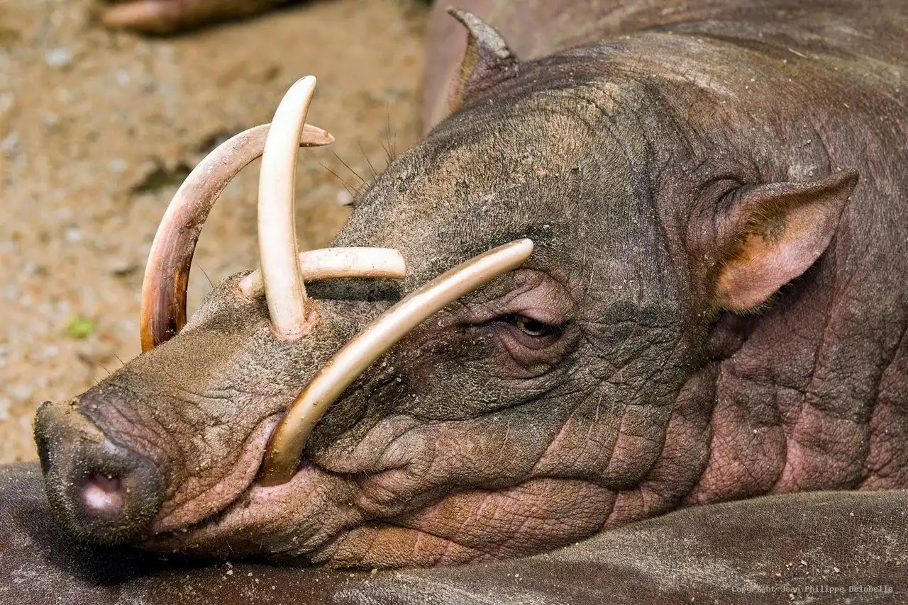 Если быть точнее, то это даже не рога, а такие большие клыки. Причем, чем старше бабирусса, тем длиннее эти клыки. Как можно видеть на фото, они очень сильно изгибаются, почти на 180 градусов. У старых свино-оленей они даже врастают в кожу головы.