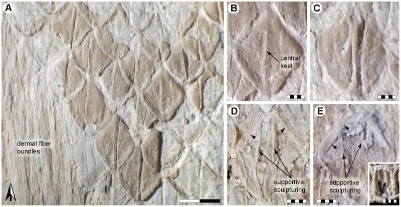 Тело мозазавров было покрыто мелкой чешуёй (сохранились отпечатки кожи), чешуйки были не крупнее таковых у гремучей змеи. Чешуйки были ромбические и каждая обладала продольным «килем» - он направлял микротоки воды вдоль тела и снижал сопротивление воды при движении, гася турбулентность.