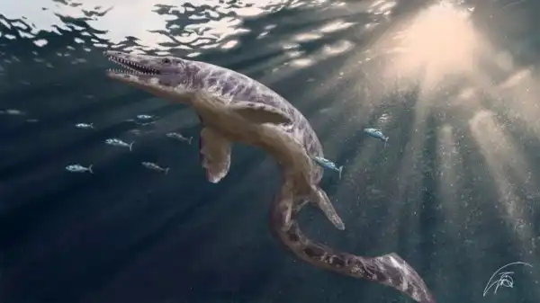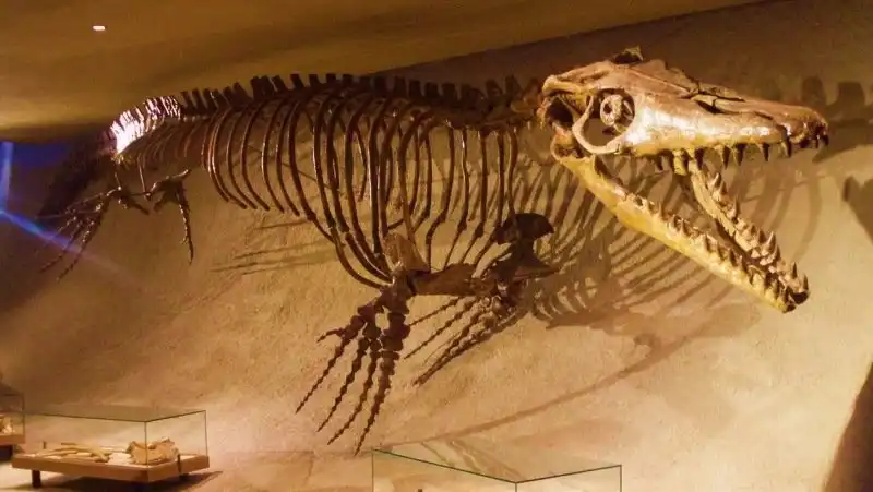 Этой же цели служила и особая структура кожи, напоминавшая таковую у современных китов и дельфинов: множество переплетенных жестких волокон препятствовали образованию складочек и морщинок при сгибании, снижая трение о воду. Мозазавры были стремительны. Хвосты одних видов напоминали весло, других – хвост акулы, только перевернутый – позвоночник заходил не в верхнюю лопасть хвостового плавника, а в нижнюю.
