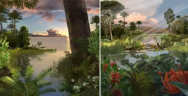 Отдельные массивы суши, разобщенные сильнее, чем нынешние материки, с обширными мелководными – в несколько десятков метров глубиной – хорошо прогреваемыми, кишащими живностью морями между ними. Европа и Северная Америка вообще представляли собой архипелаги, наподобие современной Сунды.