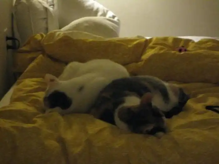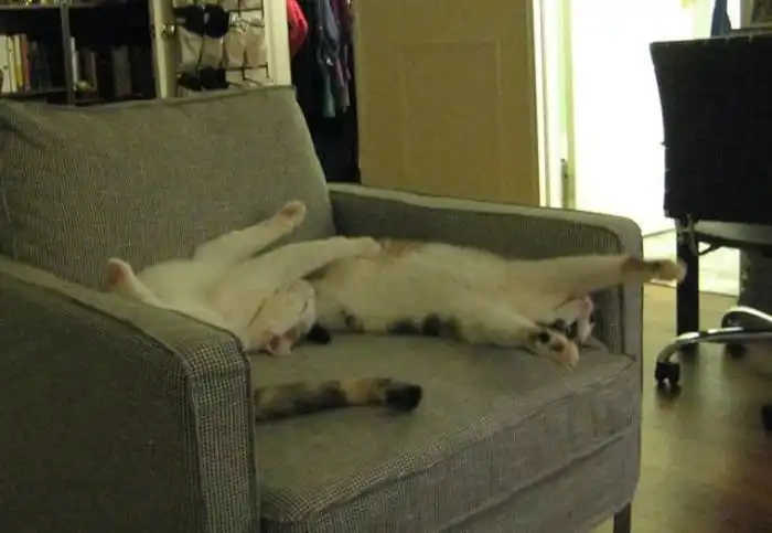 Эти кошки по кличке Калли и Хлоя являются сестрами, и они были неразлучными с самого момента своего рождения. Животные проводят друг с другом все свое время, а потому принимают одинаковые позы и в точности копируют движения друг друга, делая все в унисон.