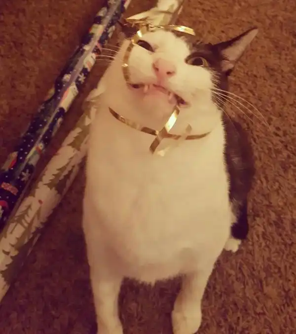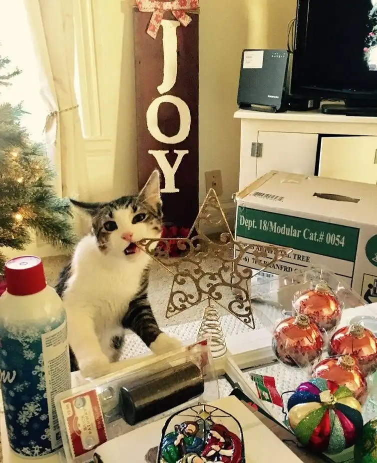 Людям кажется, что кошки ненавидят новогодние праздники, потому как на первый взгляд они всячески стараются его уничтожить. На самом деле они любит их, потому как когда их дом ещё наполнится таким огромным количеством игрушек и блестящих штук, на которые можно взобраться и побить их лапой. 20 смешных кошек празднующих Рождество ждут вас далее!